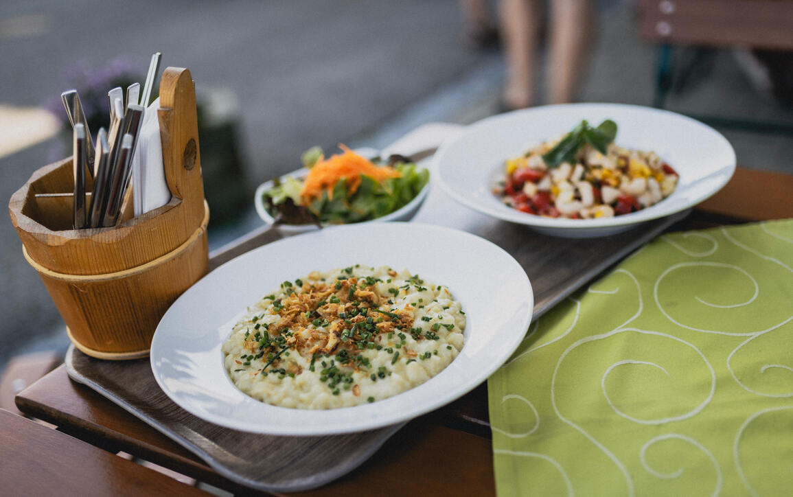 Stärkung gefällig? Dann nichts wie hin auf die Sonnenterrasse oder in die gute Stube des Buron Stadl. Dank regionaler und nachhaltiger Zutaten können Schleckermäuler mit gutem Gewissen genießen.